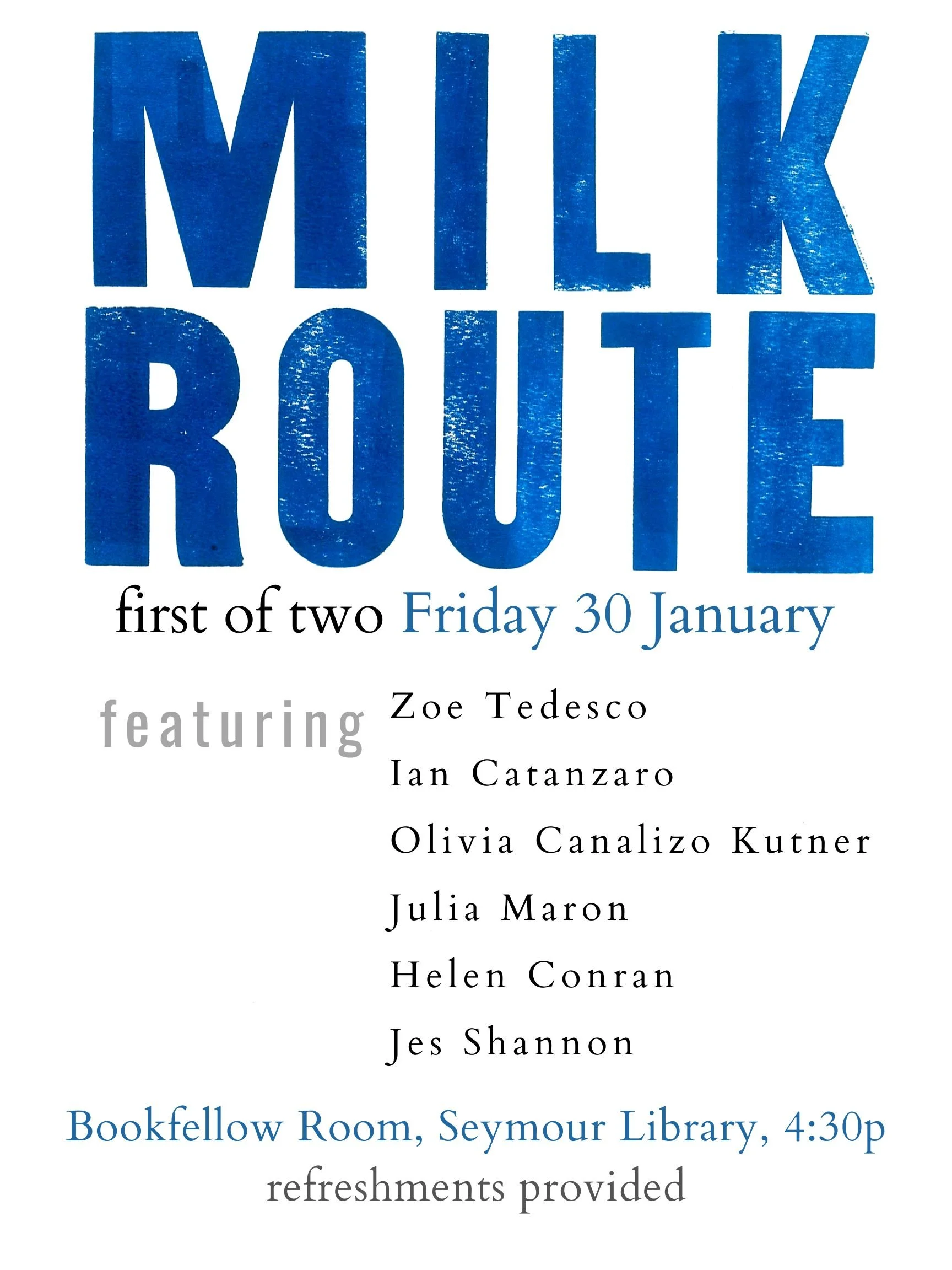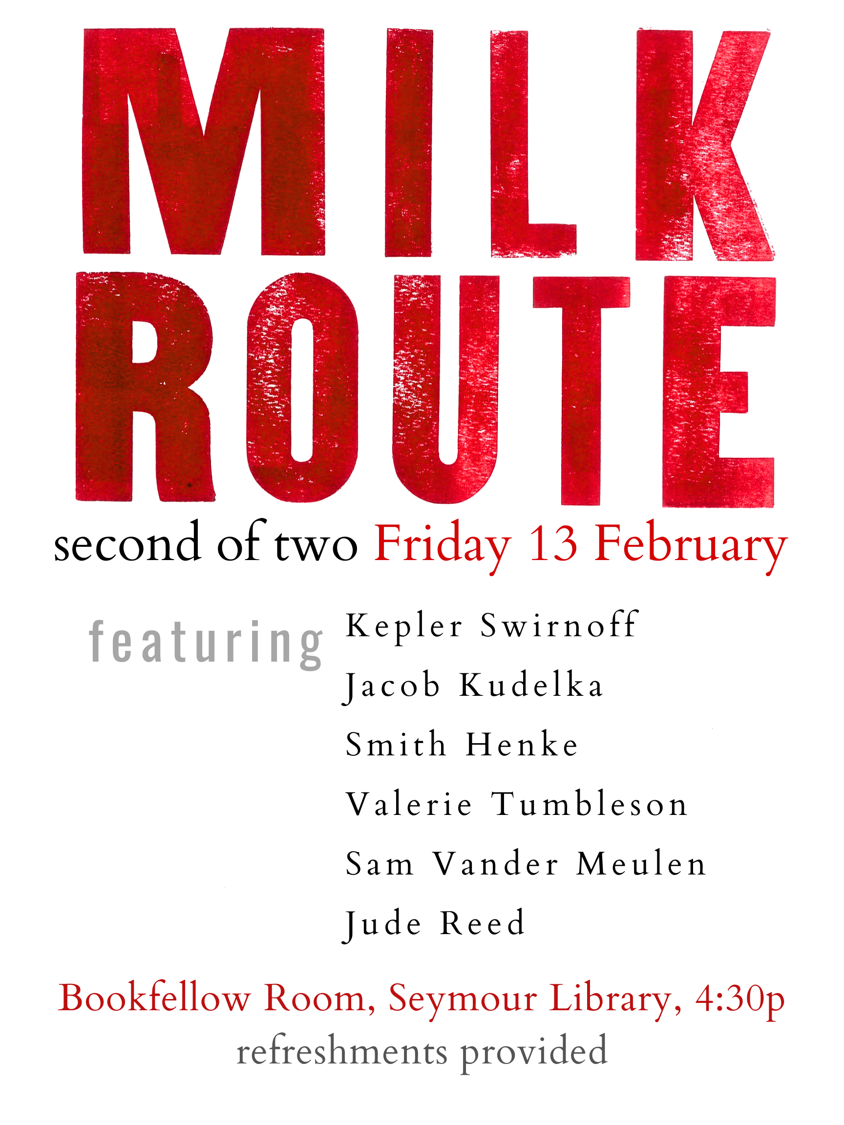 MILK ROUTE is the Creative Writing major’s capstone reading series. An homage to Carl Sandburg, who at the age of thirteen left school to get a job driving a milk wagon so that he could assist in supporting his family, Milk Route honors the transitional period in which our senior writing majors may find themselves. While finishing their studies at Knox, they also are beginning their lives as adults, discovering new experiences in jobs, graduate programs and cities of residence. All the while, too, they are still making room to make their art. Students and faculty gather for these formal readings, which offer senior writing majors an opportunity to share from their own work. In conjunction with the capstone portfolio course, participation in Milk Route fulfills the College’s Oral Competency requirement for writing majors.